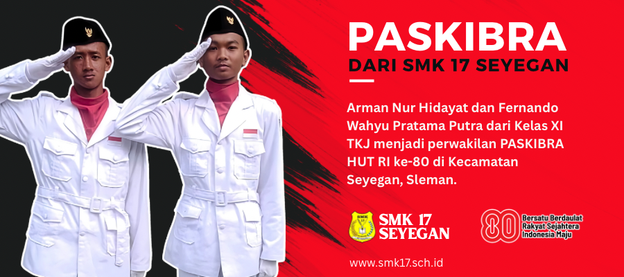 Sleman, 11 Juli 2025 – SMK 17 Seyegan kembali menunjukkan prestasi membanggakan melalui partisipasi aktif dalam peringatan Hari Ulang Tahun Kemerdekaan Republik Indonesia (HUT RI) ke-80. Dua siswa terpilih, yaitu Arman Nur Hidayat dan Fernando Wahyu Pratama Putra dari kelas XI Teknik Komputer dan Jaringan (TKJ), telah ditugaskan sebagai anggota Pasukan Pengibar Bendera (PASKIBRA) tingkat Kecamatan Seyegan, Sleman.