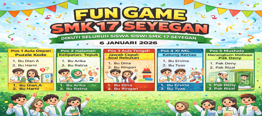 Seyegan, 6 Januari 2026 — SMK 17 Seyegan menyelenggarakan kegiatan FUN Game yang diikuti oleh seluruh siswa dan siswi SMK 17 Seyegan. Kegiatan ini berlangsung meriah pada Selasa, 6 Januari 2026, dengan memanfaatkan beberapa titik lokasi di lingkungan sekolah.