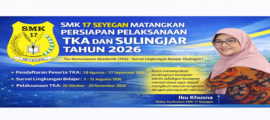 Seyegan, Februari 2026 – SMK 17 SEYEGAN melakukan berbagai persiapan dalam rangka pelaksanaan Tes Kemampuan Akademik (TKA) dan Survei Lingkungan Belajar (Sulingjar) Tahun 2026 sesuai dengan surat edaran dari Dinas Pendidikan, Pemuda, dan Olahraga Daerah Istimewa Yogyakarta Nomor B/400.3.1/4753/D14 tanggal 18 Februari 2026.