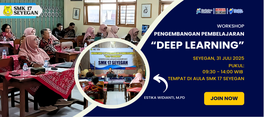 Seyegan, 31 Juli 2025 — SMK 17 Seyegan kembali menunjukkan komitmennya dalam peningkatan mutu pendidikan dengan menyelenggarakan Workshop Pengembangan Pembelajaran “Deep Learning” pada hari Rabu, 31 Juli 2025. Kegiatan ini berlangsung mulai pukul 09.30 hingga 14.00 WIB, bertempat di aula SMK 17 Seyegan, dan diikuti oleh seluruh guru serta kepala sekolah SMK 17 Seyegan.