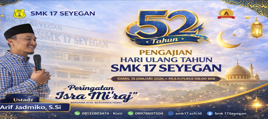Dalam rangka HUT SMK 17 Seyegan yg ke 52, sekolah mengadakan pengajian pada hari kamis, 15 Januari 2026 pada pukul 08.00 WIB. Utk acara tersebut aturan seragam yg dipakai adalah: